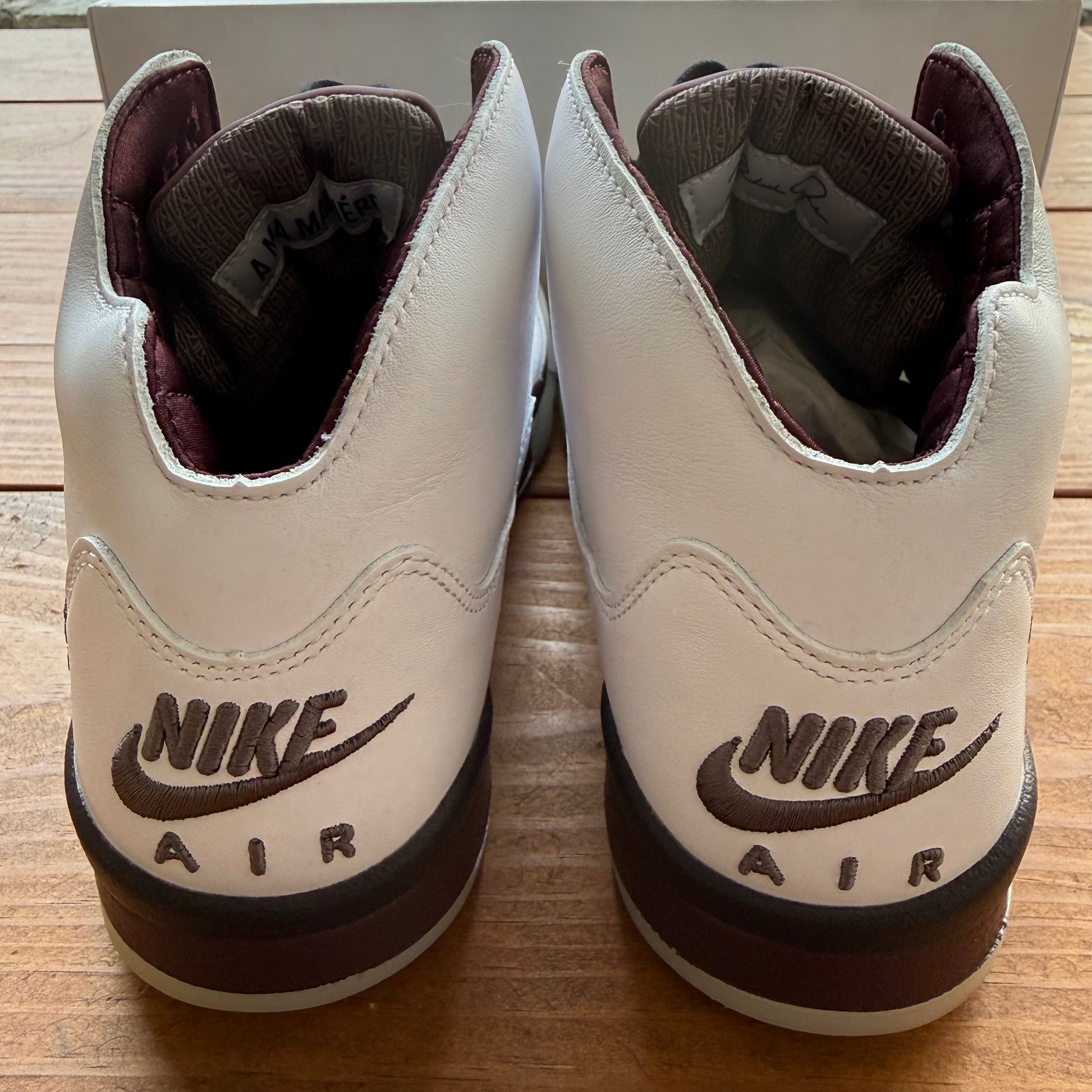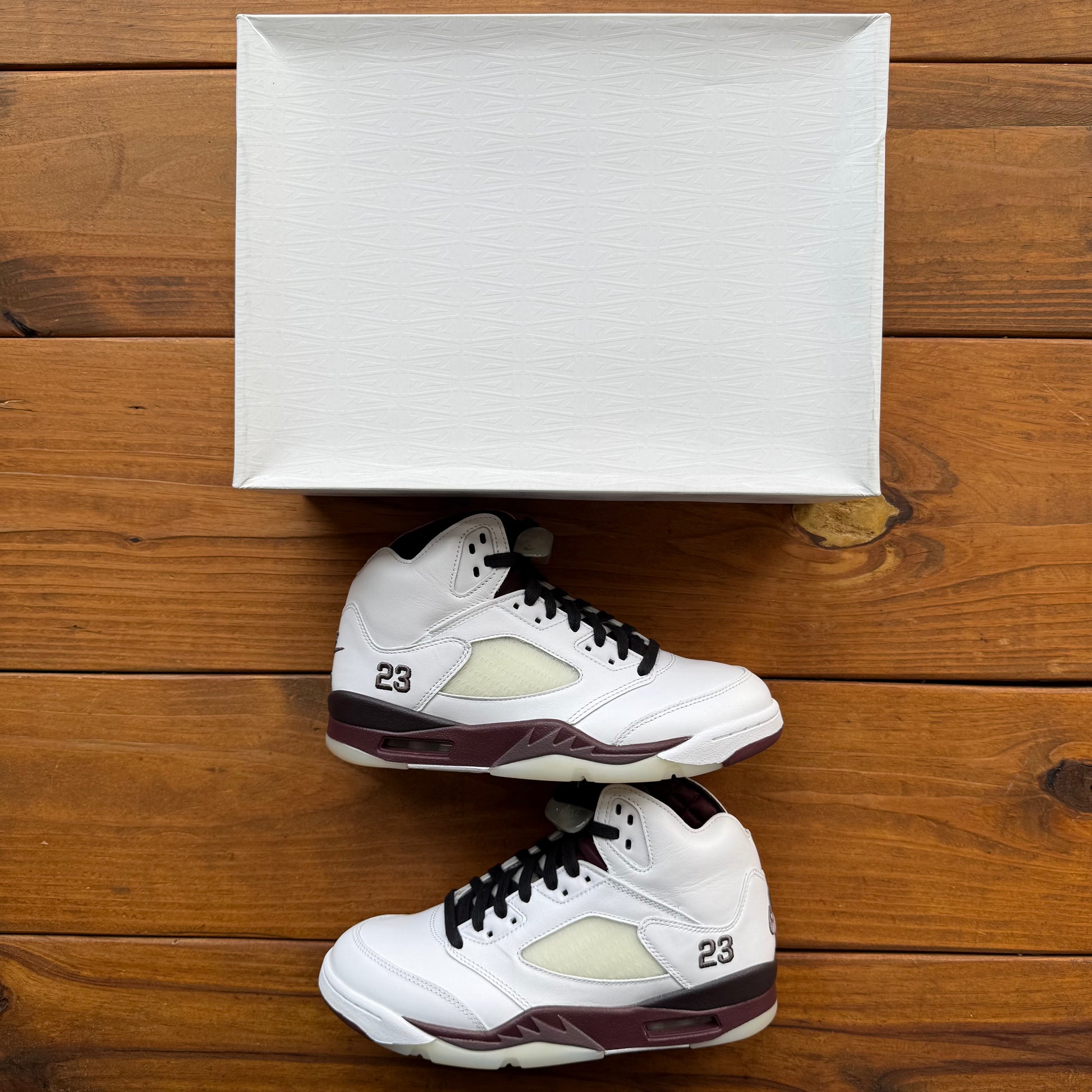 The A Ma Maniere x Air Jordan 5 'Black Collective' rocks a white leather upper with a pre-yellowed quarter panel netting and an embroidered '23' signoff. Rich quilted burgundy lines the interior, matching the Nike Air heel logo as well as the tongue. The latter has a Jumpman logo on the right shoe and A Ma Maniere's 'A' emblem on the left. Another splash of burgundy occupies the midsole, accented with matching sharktooth details, complemented by an aged, see-through rubber outsole.