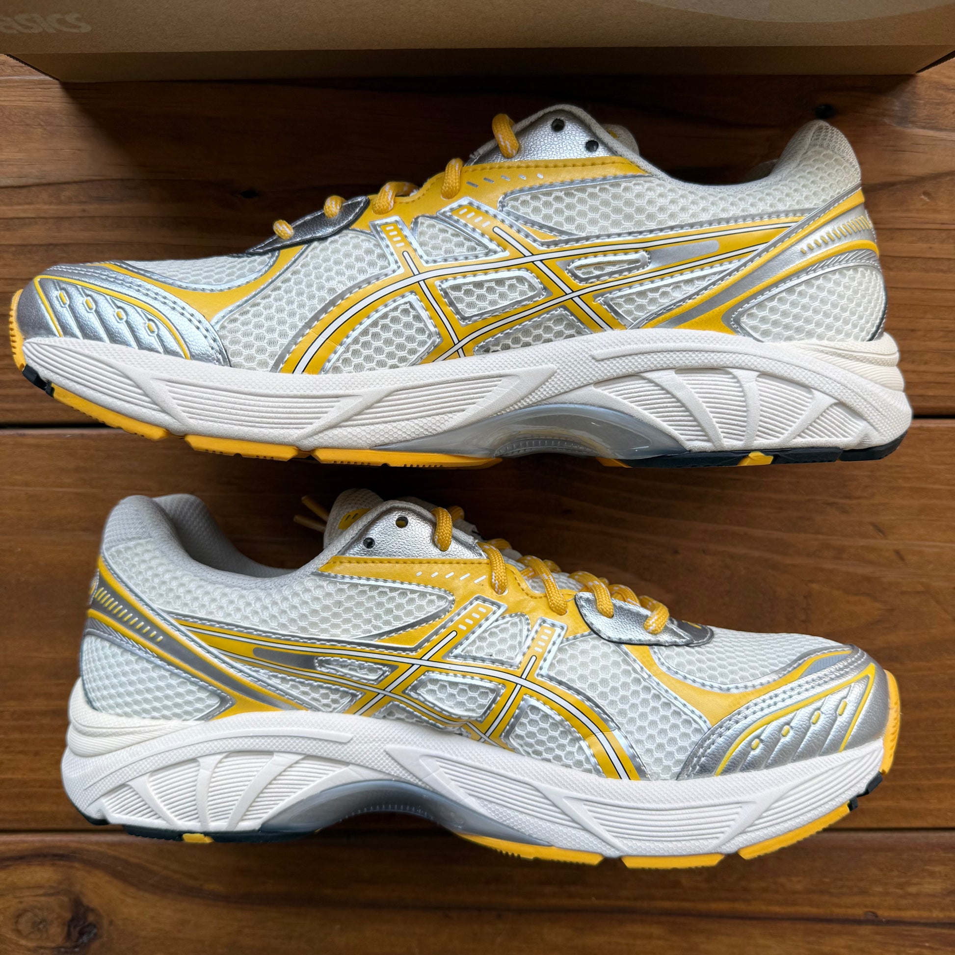 The 2025 version of the Kith x ASICS GT 2160 'Cream Solar Power' dons an ivory open-cell mesh upper with silver and yellow synthetic leather overlays. An off-white foam midsole contains GEL heel inserts for a plush feel. The rubber outsole is complemented by a plastic shank known as the TRUSSTIC support system, aiding arch support and providing torsional rigidity.