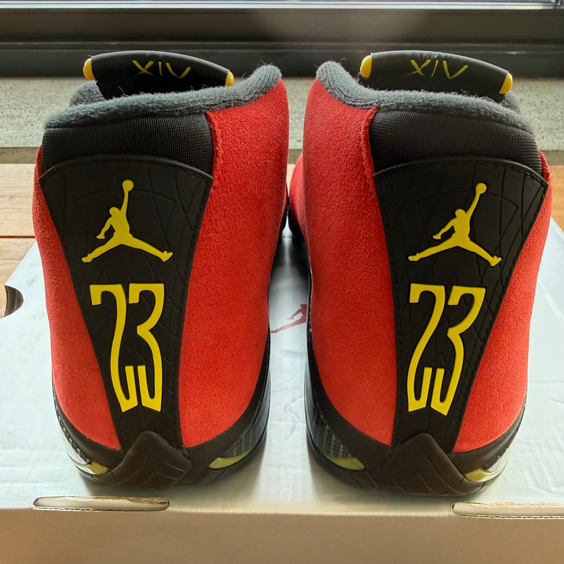 The 2025 version of the Air Jordan 14 Retro 'Ferrari' stays true to the sneakers' auto inspirations. Loyal to the 2014 release, these shoes have a one-piece red suede upper with contrasting black pops on the tongue, collar lining and heel, stamped with an embossed Jumpman and a yellow '23' signoff. A matching Jumpman emblem adorns the collar, while the black Phylon midsole gets an exposed, chrome-plated chassis and resilient forefoot and heel Zoom Air units for a plush feel.